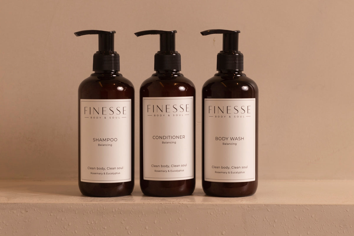 Los aceites esenciales de romero y eucalipto son la base de Finesse, no solo por sus beneficios visibles en tu cabello y tu piel, sino también por la sensación única que despiertan en ti. Los olores activan nuestras emociones. Por eso, al abrir tu productos de Finesse, se genera un aroma familiar que despierta tus mejores recuerdos. Piensa en el aroma fresco del eucalipto que te ponían cuando tenías un resfriado y en como te sentías luego, el aroma tan familiar del romero que se encuentra en nuestra tierra... son aromas que te transportan a buenos momentos, te elevan; ese es el aroma de tus productos de Finesse.